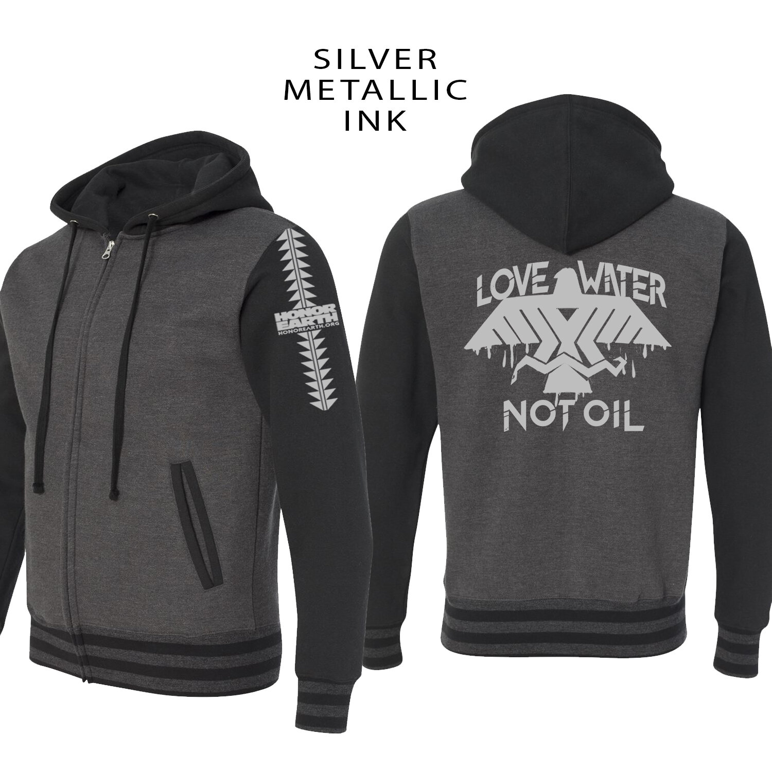 LIMITED EDITION Honor the Earth NEW COLLECTION! In the making an exclusive line of Unisex Varsity Hooded Full-Zip Sweatshirt for Honor the Earth this year - our “Love Water Not Oil - Thunderbird,” Design screen printed on the back in silver chrome.