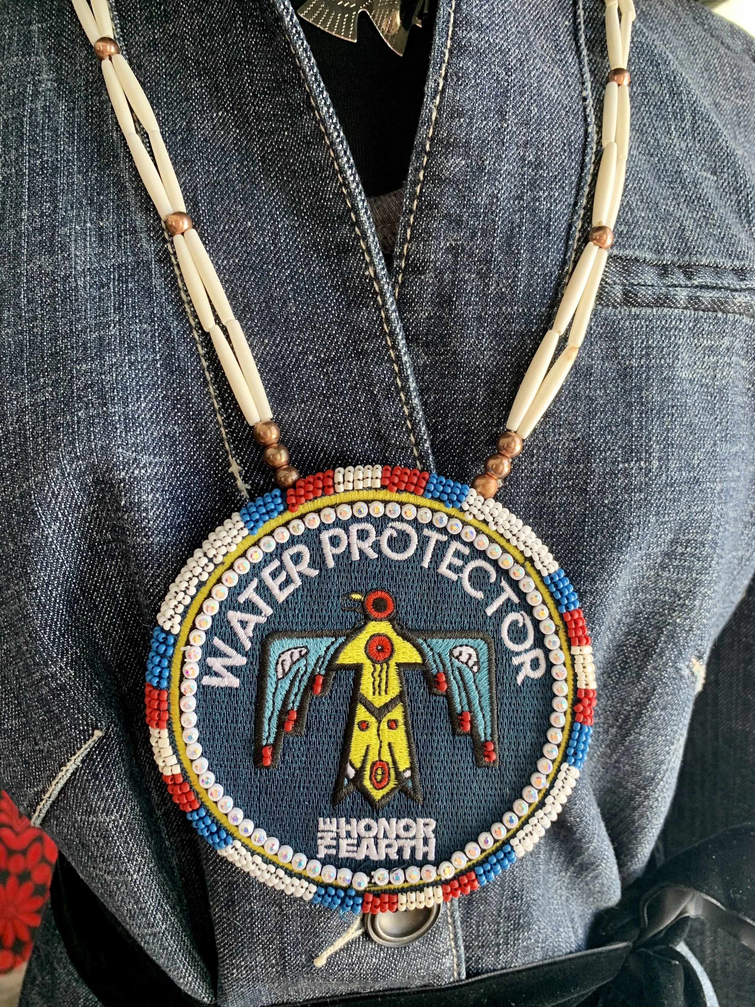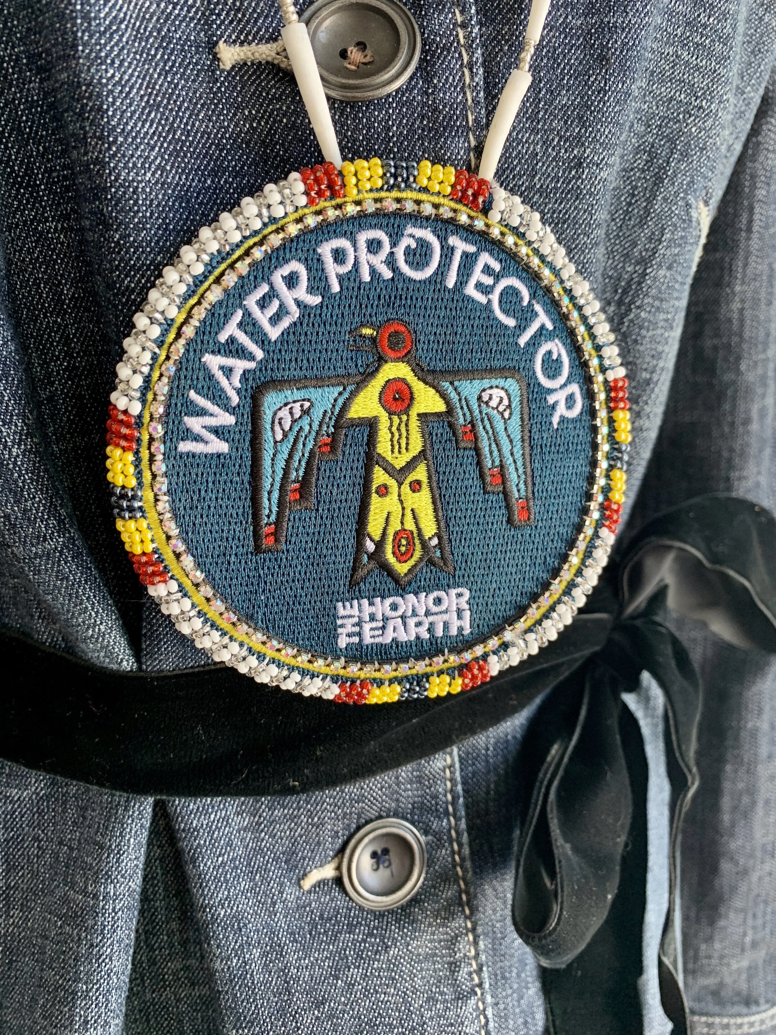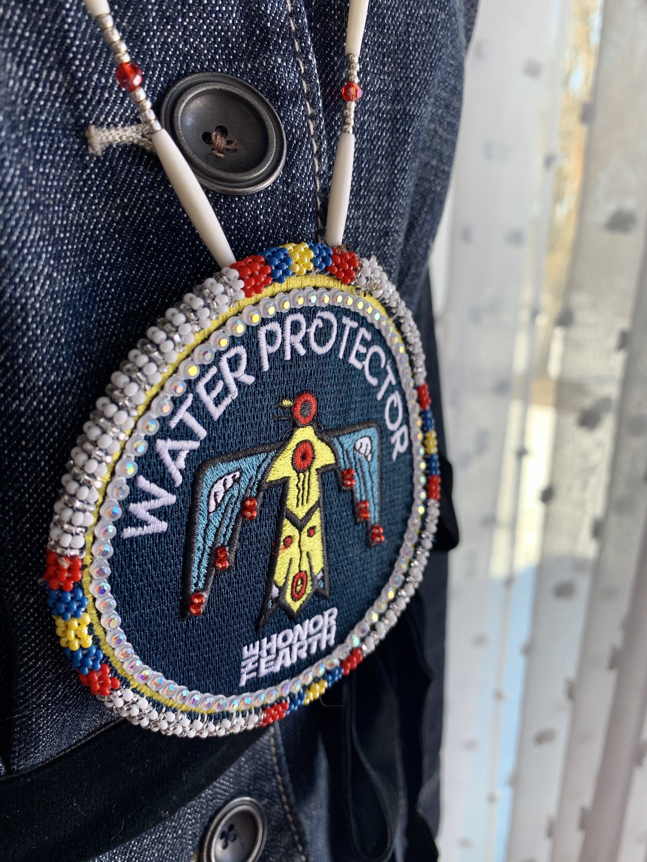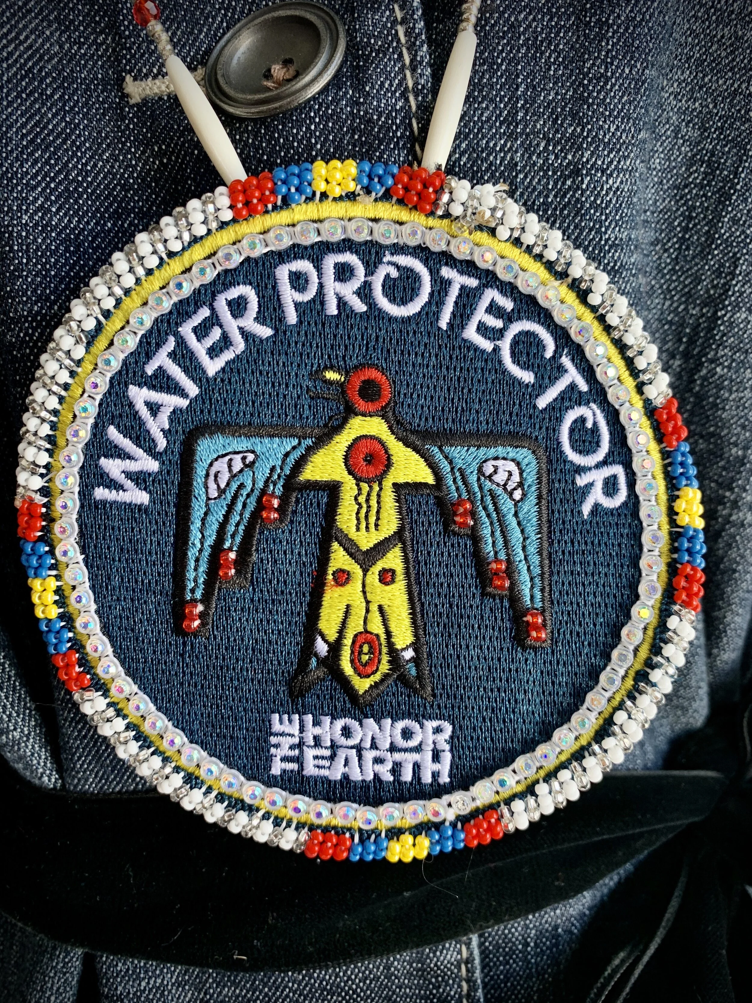 Beadwork designer is Gina Standing Cloud of the Leech Lake Band of Ojibwe, MN with artwork by a frontline Water Protector designer.