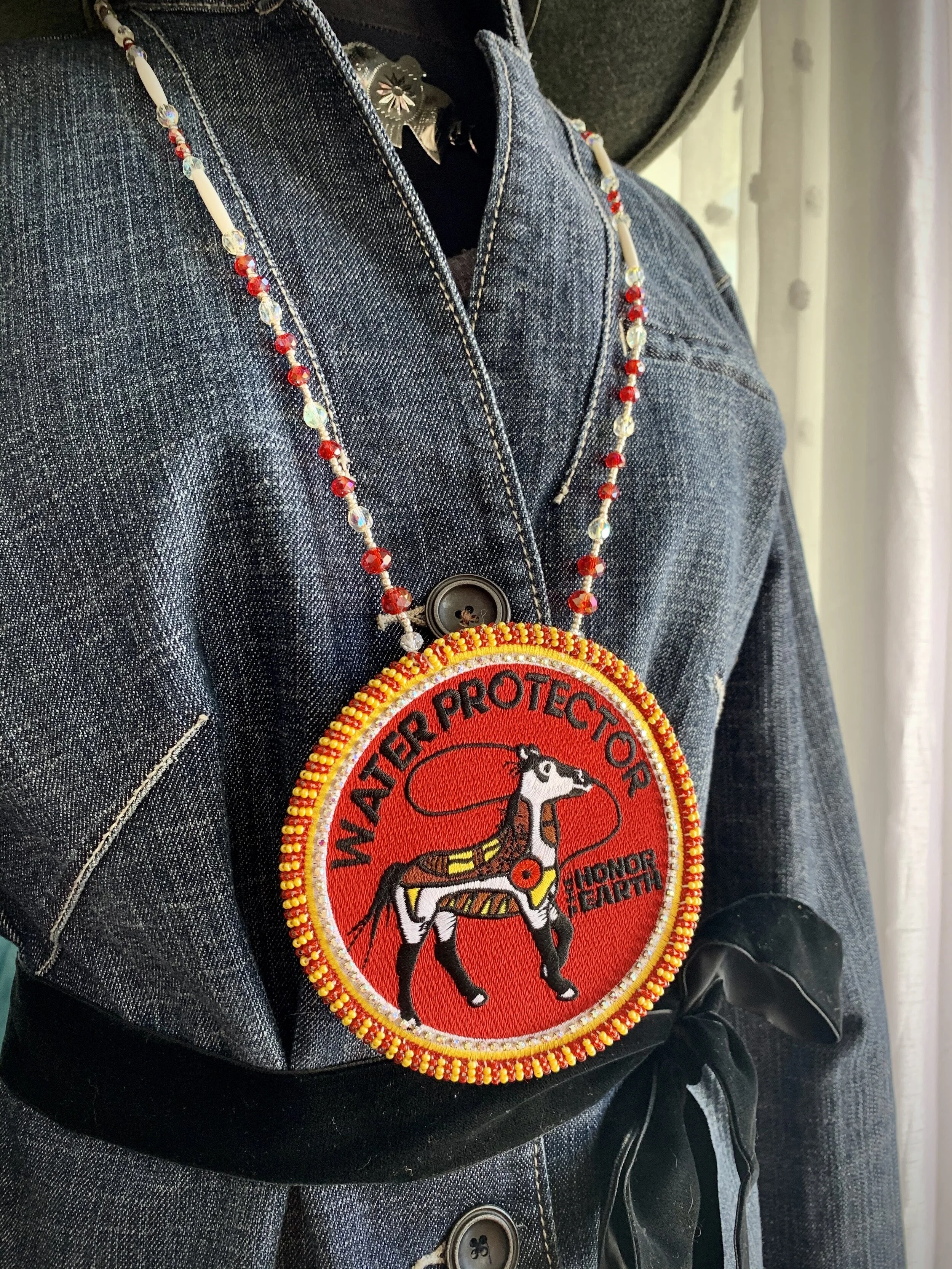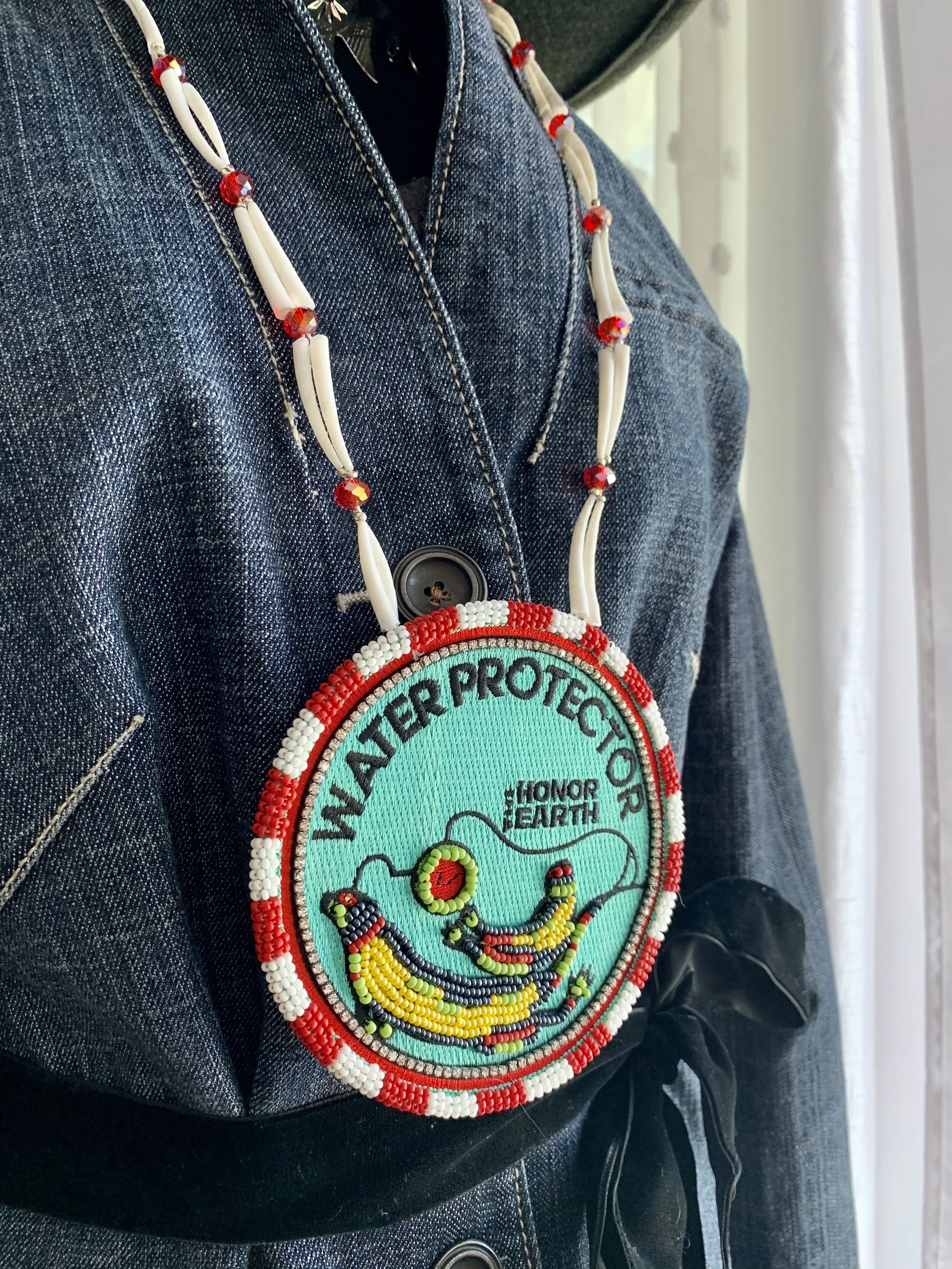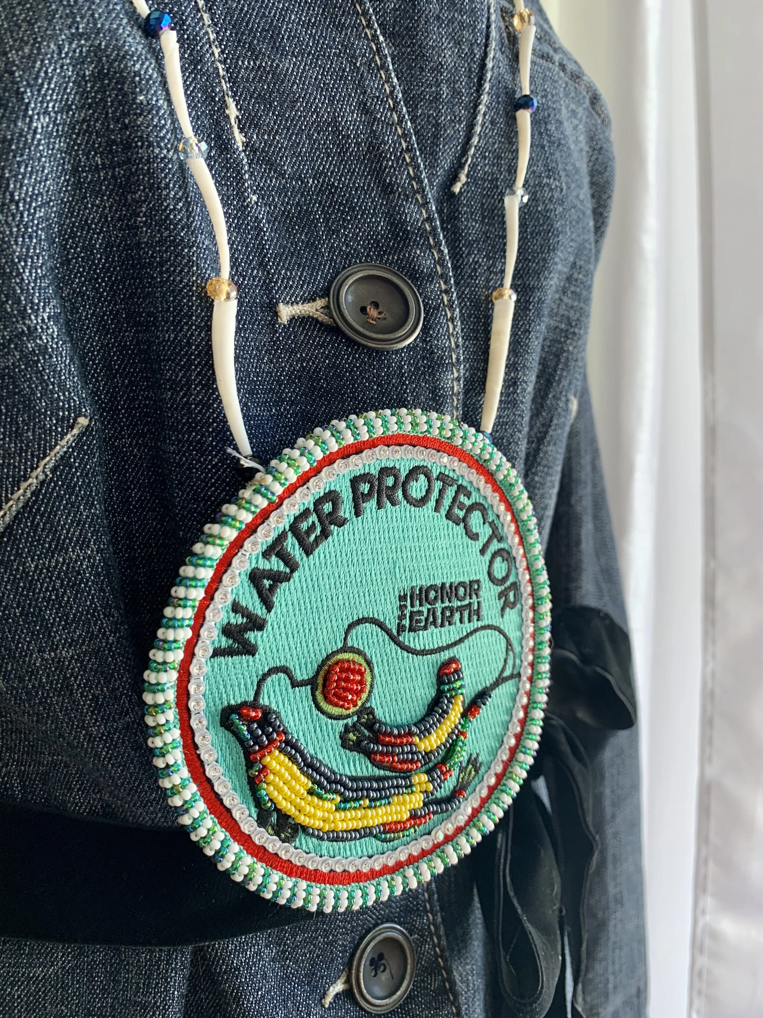 Stop Line 3 - Water Protector Medallion. Beadwork is in a cornflower blue with red and yellow accents beaded onto Honor the Earth’s embroidered patch with deer smoke tanned leather backing. This medallion also has beadwork inside the patch, and is extremely skillful technique to do this, and time consuming. The hand beaded chain is 18” in length approx. Exquisite and beautiful honoring Water Protectors who will Stop Line 3 protecting our water.