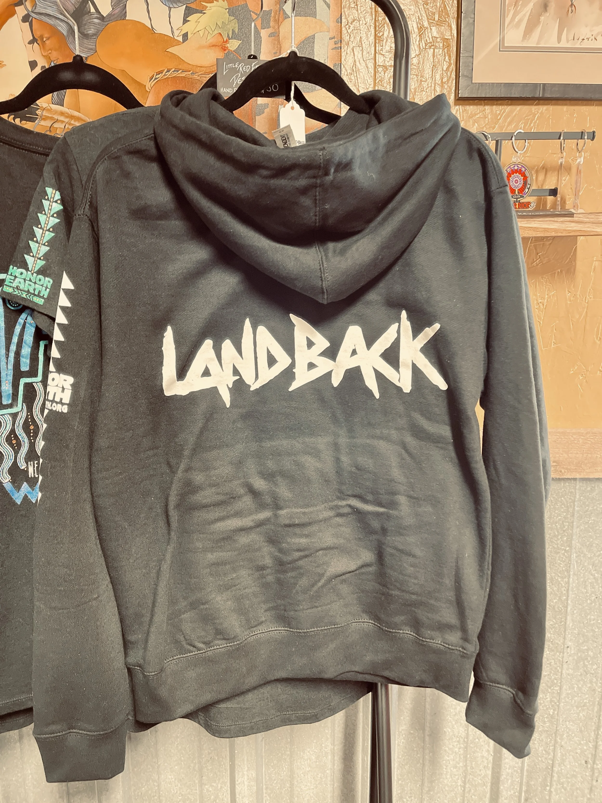 Land Back Heavyweight Hooded Sweatshirt is a generous fit with fleece lined hood and 80/20 cotton/polyester blend 3-end fleece with 100% cotton face.