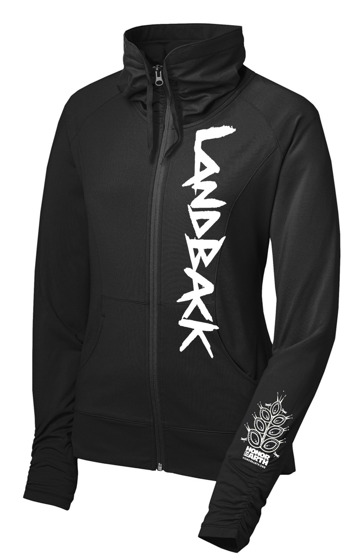 Land Back Sport-Tek Sport-Wick Stretch Full-Zip Jacket just for the ladies. This jacket has front pouch pockets and ruching at sleeves where our new design icon, Mino Bimaadiziwin, sits.