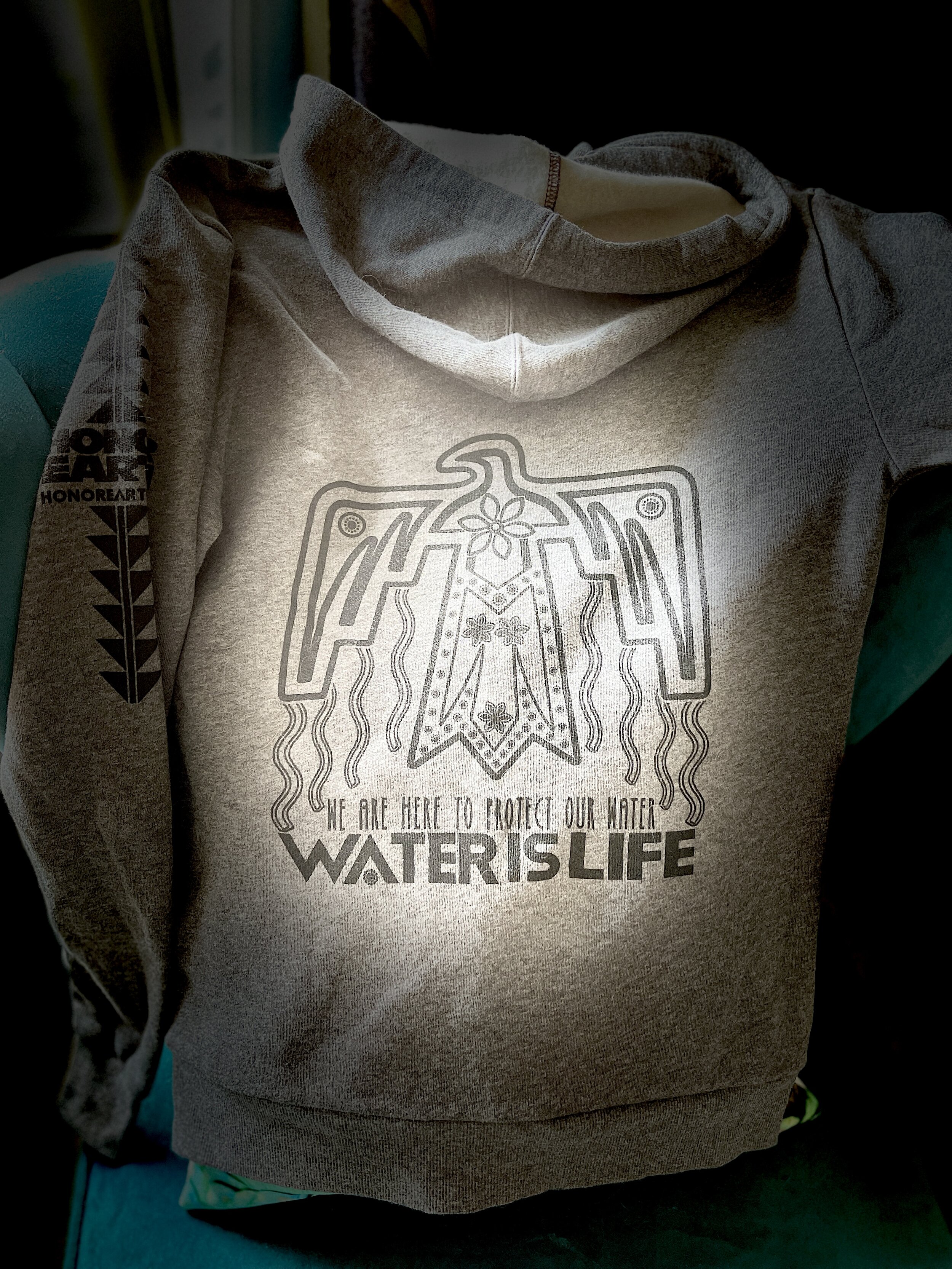 Garment is a nice midnight navy or a classic grey (limited quantity) printed in white color with Water is Life design in front with Honor the Earth logo printed close to our hearts, left arm. 10 oz, 80/20 polyester/cotton blend water-resistant fleece body.