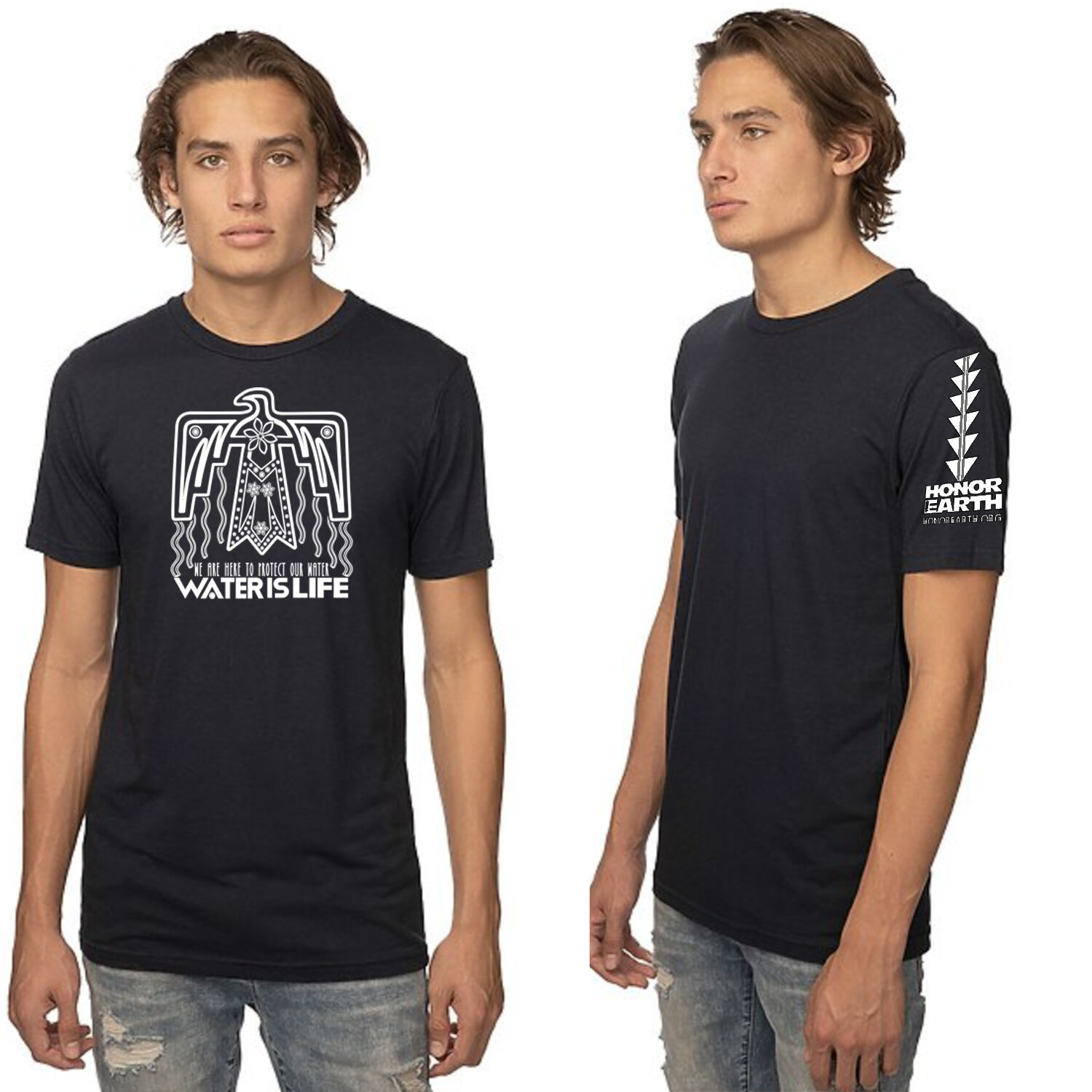 Garment is a nice denim navy printed in an earth sand color with Water is Life design in front with Honor the Earth logo in the back. FEATURES: Sustainable and environmentally friendly. Silky soft and great drape. See image for size chart.