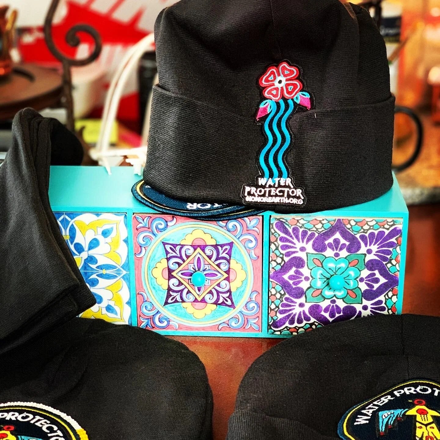 Organic Cotton Beanies for Water Protectors. We have two designs available at a limited quantity. We are locally assembling and preparing the beanies and each one is unique and not the same. You have the option to order with beadwork or without. The beadwork is hand beaded locally in the White Earth Reservation village areas by Anishinaabe people who are amazing artists, and are water protectors.