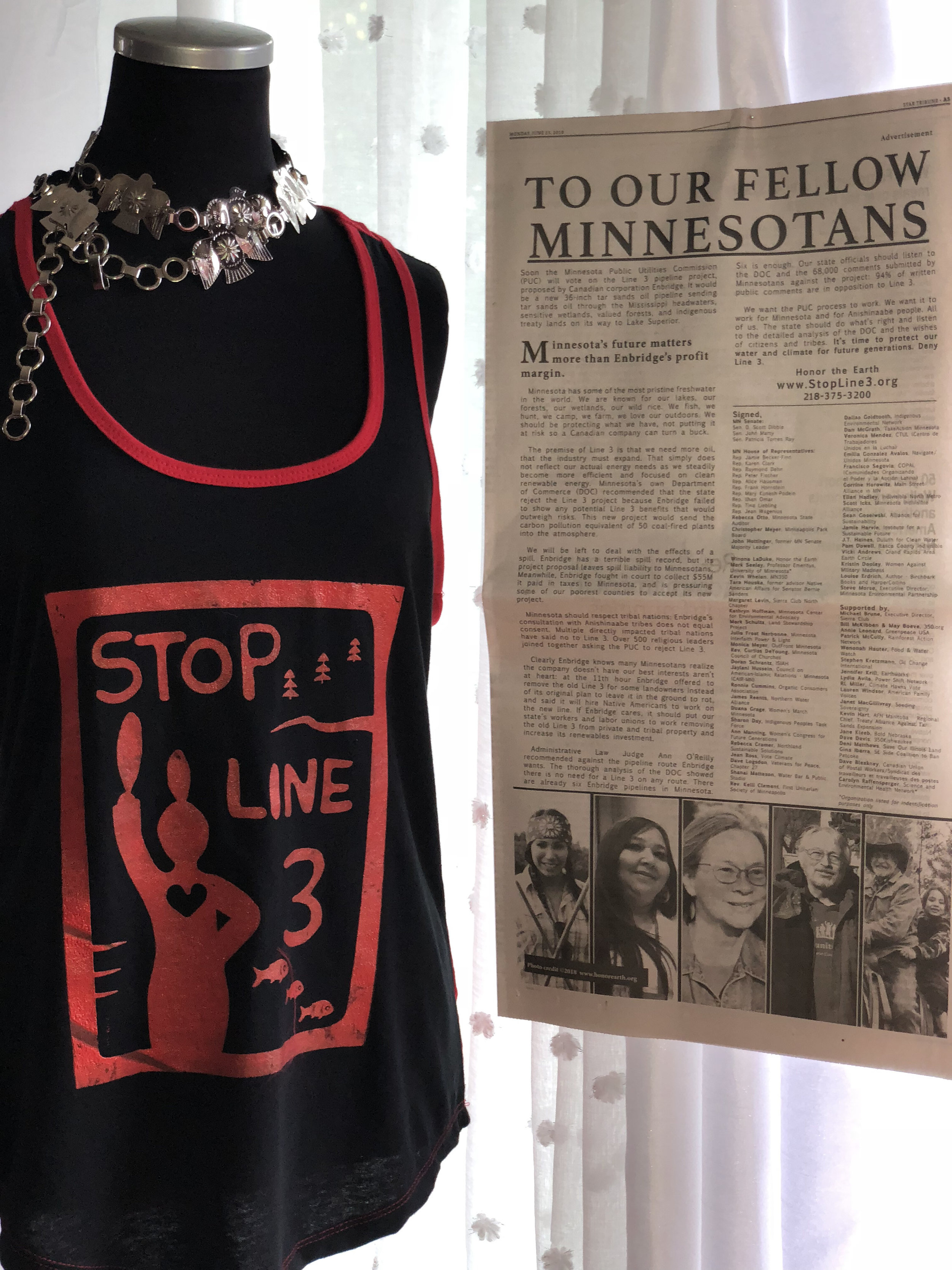 #StopLine3 Art of Resistance by Issac Murdoch: “Line 3 is an Enbridge pipeline that ships crude oil from Alberta to Superior, Wisconsin. It spans northern Minnesota, crossing the Leech Lake and Fond du Lac reservations and l855 and l842 treaty areas. Enbridge is proposing new corridor through our watershed and Ojibwe treaty territories, expanding Line 3 into the largest project in Enbridge’s history. This is a dangerous corridor having been fighting for years to stop Line 3 and protect our future generations.” The MN PUC is set to make a decision soon June 2018 in MN! However, Line 3 is met with passionate deep resistance by First Nations and allies from the start up in Canada through out Turtle Island. Water Protector Cultural camps as acts of resistance has been spread out as the rivers flow where their battle continues. Line 3, Enbridge, Trans Mountain, Kinder Morgan, Bayou Bridge, KXL and more is the belly of the tar sands beast. These are all connected! Wearing these shirt reflects your expression to support and take a stand in the resistance against extreme fossil fuel extractions. Start a conversation; rock your garments!