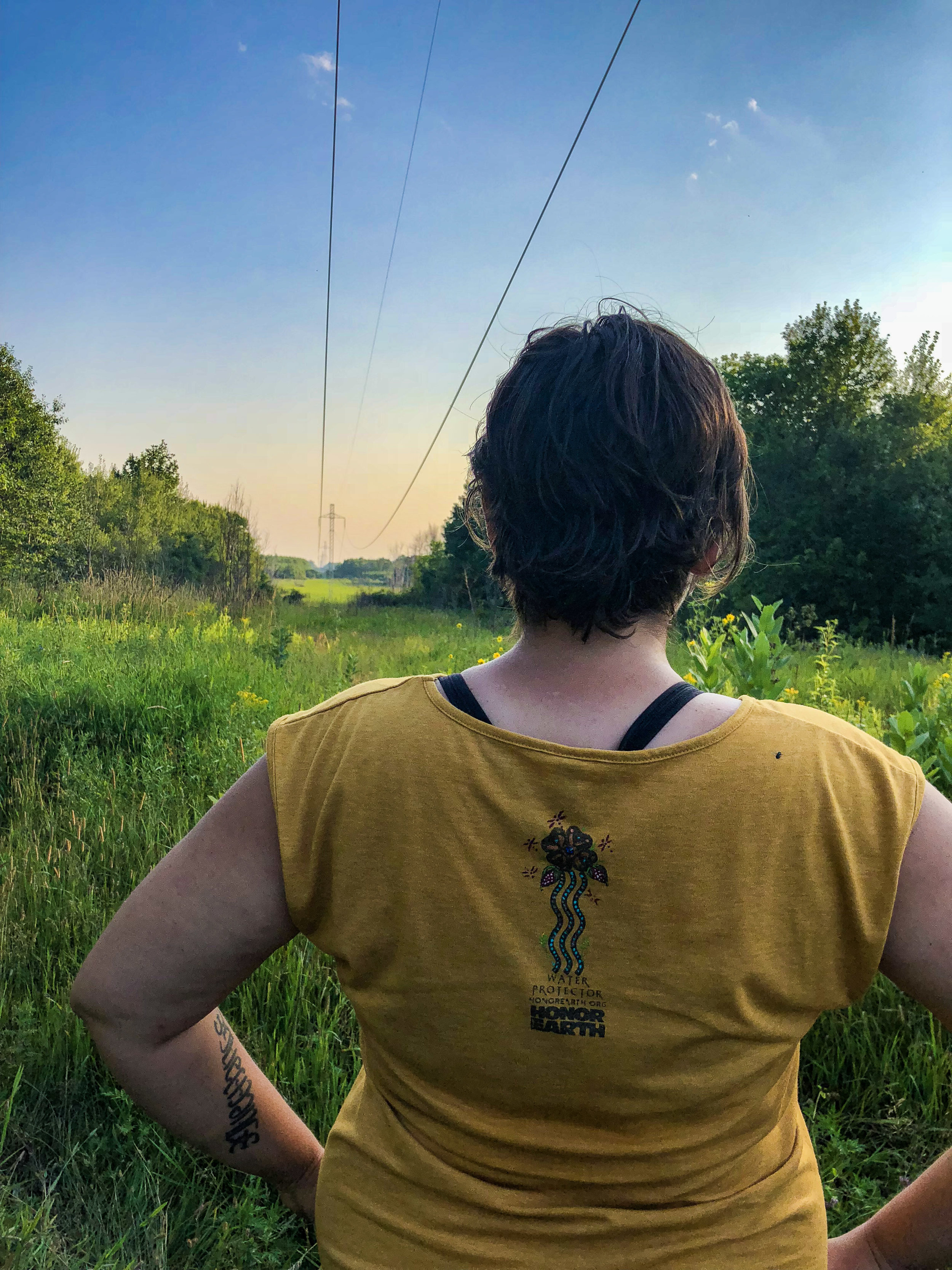 Artwork by Christ Belcourt with Isaac Murdoch of the Onaman Collective, featuring Christi Belcourt's "Heart with a Fist" Water Protector image. . Here is an important initiative called that Honor the Earth supports: NIMKII AAZHIBIKONG Collective. Garment also features Honor The Earth’s beautiful floral “Water Protector,” logo on the garment designed by LittleRedfeather..