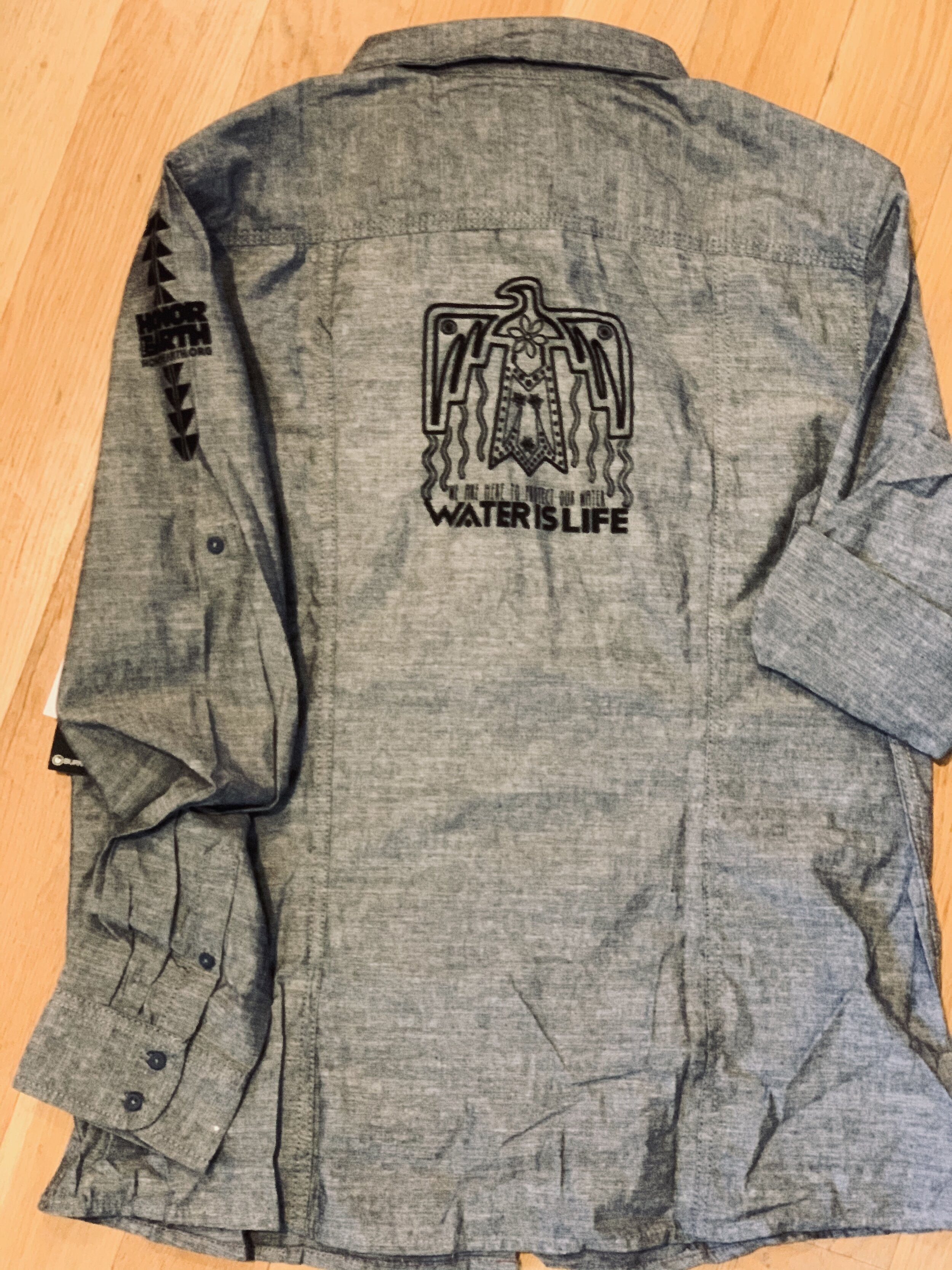 Garment is Light Denim in color. A nice stylish button shirt for all seasons loved by women horse riders, and wondering the outdoors with Water is Life design in the back with Honor the Earth logo on the left arm. FEATURES: 34 oz., 80/20 cotton/polyester.