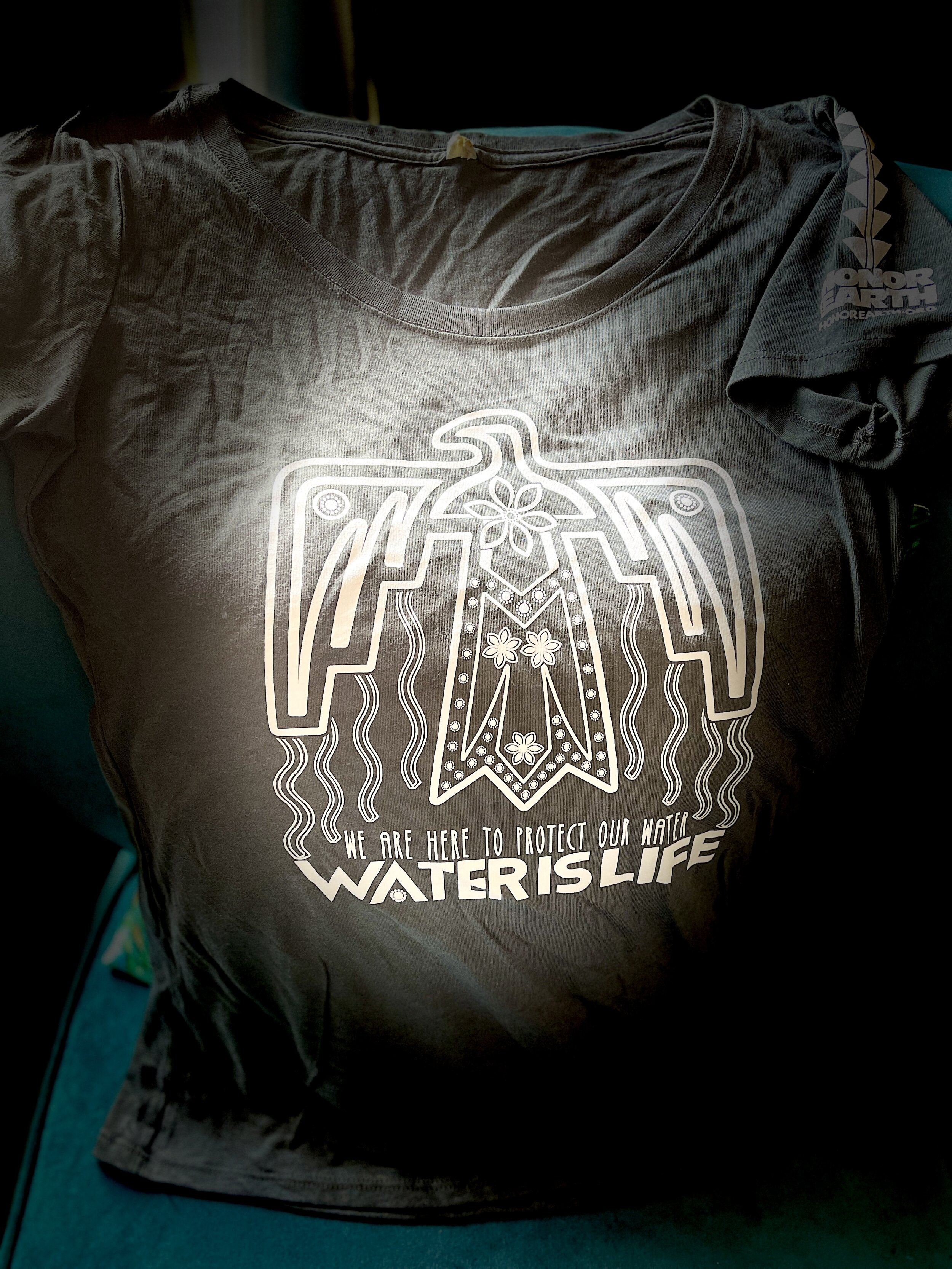 We Love our Water, and Manoomin (Wild Rice), not their dirty oil for Water is Life (Nibi Bimaadiziwin). Garment screen printed is part of our youth and community project at Pine Point: Jio Misawaabandaaming; how we envision our future, is a worldview of positive thinking. Creating: ‘mino bimaatiziiwin,’ a good life, here at Pine Point and Round Lake (White Earth territory). We love our otters as we do our mothers and baby water protectors!